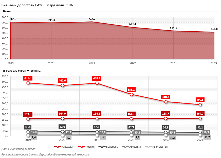 В денежном выражении общий внешний долг стран ЕАЭС с 2019 по 2024 год уменьшился на 27,2%, до 518,8 млрд долл. США. Наибольшая доля по-прежнему приходится на Россию, чьи долги перед внешним миром в прошлом году составили 290,8 млрд долл. США. И это единственная страна ЕАЭС, которая показала резкое сокращение обязательств за эти годы: сразу на 40,8%. Это произошло из-за антироссийских санкций и ограничения доступа бизнеса к международным финансовым рынкам.