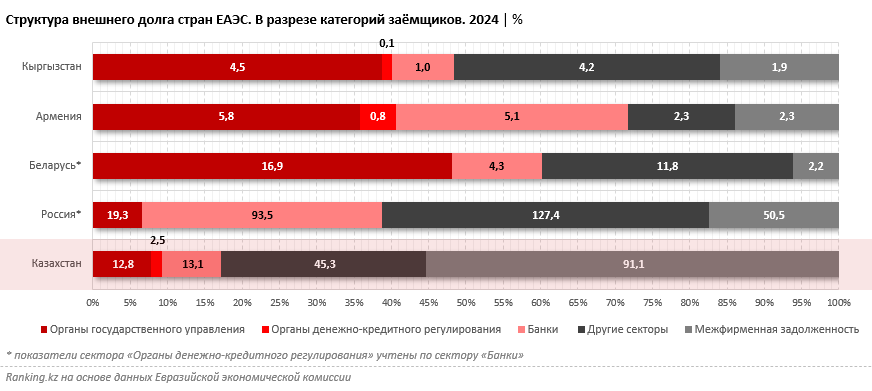 По структуре внешних финансовых обязательств страны ЕАЭС сильно отличаются. Например, в Казахстане в прошлом году больше половины (55,3%) долга составляла межфирменная задолженность: 91,1 млрд из 164,7 млрд долл. США. Непосредственно на госдолг приходилось 7,8%, на банки – 8%.