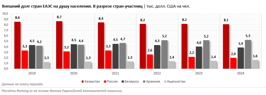 Согласно расчётам на основе данных Евразийской экономической комиссии (ЕЭК), в 2024 году подушевой внешний долг Казахстана составил 8,1 тыс. долл. США на человека. В сравнении с показателями 2019–2023 годов это наименьшее значение: ранее сумма достигала 8,7 тыс. долл. США на человека. За пять лет показатель уменьшился всего на 5,2%.