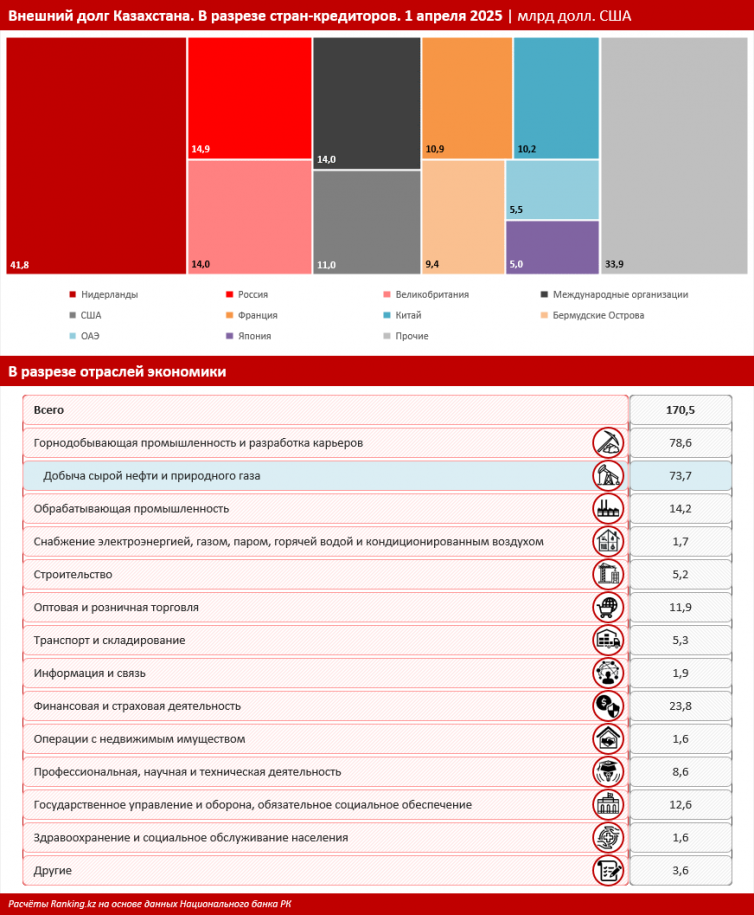 Вернёмся к РК. Предлагаем посмотреть, каким странам Казахстан задолжал такие большие деньги и на что их занимал. Согласно данным Национального банка РК, общая внешняя задолженность на 1 апреля текущего года составила около 170,5 млрд долл. США. Кредиторами для Казахстана являются 107 стран. В инфографике мы представили данные по 10 основным государствам, предоставлявшим РК международные займы. Наибольшую сумму казахстанские компании взяли в долг у Нидерландов: 41,8 млрд долл. США. На втором месте по объёму финансирования среди казахстанских кредиторов находится Россия: 14,9 млрд долл. США. Третье место с равными суммой в 14 млрд долл. США делят между собой Великобритания и различные международные организации.