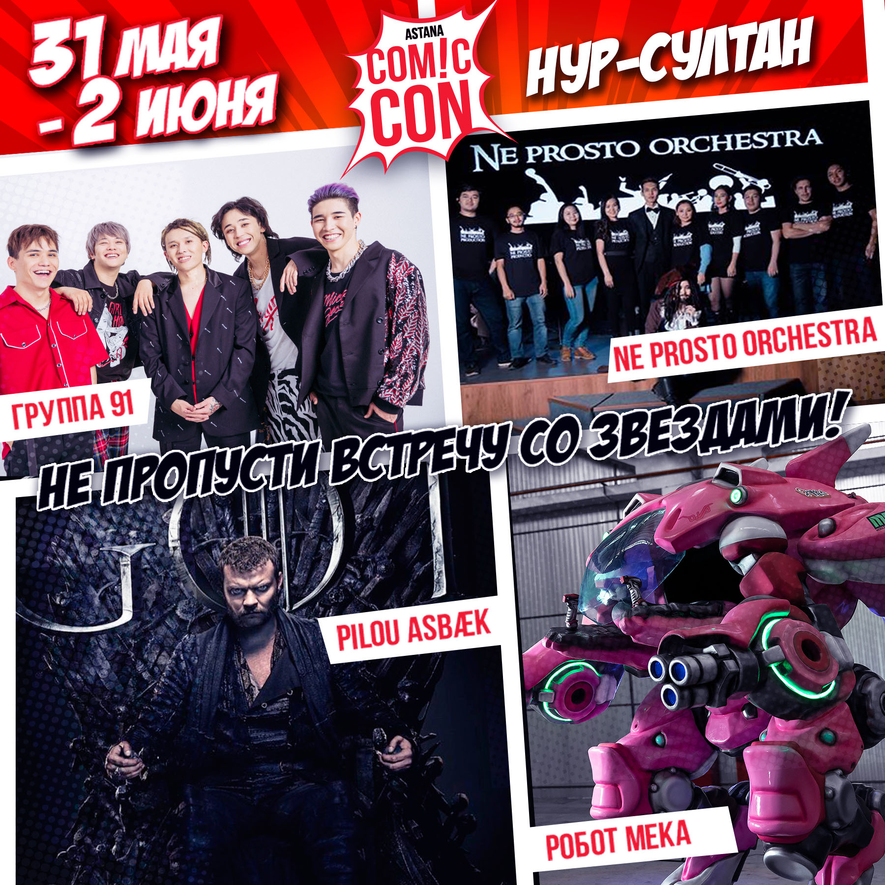 В г. Нур-Султан официально стартует один из крупнейших в мире фестивальных форматов, посвященных индустрии комиксов и основанного на них популярного искусства. Специальным гостем мероприятия станет звезда «Игры Престолов» Пилу Асбек. Также ожидается концерт популярной Q-pop группы NINETYONE. Торжественное открытие мероприятия состоится в 15.00 31 мая на основной сцене фестиваля. Место проведения – Конгресс-Центр г. Нур-Султан, сообщает Kazlenta.kz со ссылкой на пресс-службу организатора Фестиваля.