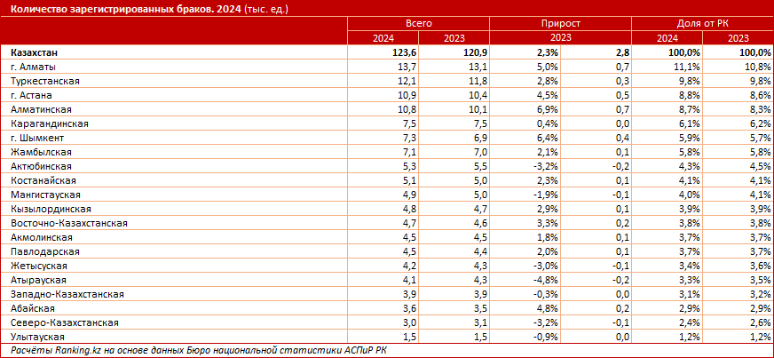 В 2024 году в Казахстане было зарегистрировано 123,6 тыс. браков – на 2,3% больше по сравнению с предыдущим годом. В региональном разрезе лидером стал Алматы, где зарегистрировали 13,7 тыс. браков – на 5% больше, чем годом ранее (13,1 тыс.). На втором месте оказалась Туркестанская область (12,1 тыс. браков), на третьем – Астана (10,9 тыс.). Меньше всего браков было зарегистрировано в Улытауской области: 1,5 тыс. Скромные показатели были также отмечены в Северо-Казахстанской (3 тыс. браков) и Абайской (3,6 тыс.) областях, передает kazlenta.kz со ссылкой на ranking.kz.