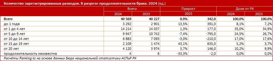 Что касается разводов, в 2024 году в Казахстане было зарегистрировано 40,6 тыс. случаев расторжения брака – на 0,9% больше, чем годом ранее. Чаще всего распадались семьи, просуществовавшие от 1 до 4 лет: количество таких разводов составило 14,2 тыс. – на 1,3% больше, чем в 2023 году. Далее идут случаи расторжения брака продолжительностью в 5–9 лет (9,9 тыс.) и 10–14 лет (6,9 тыс.).