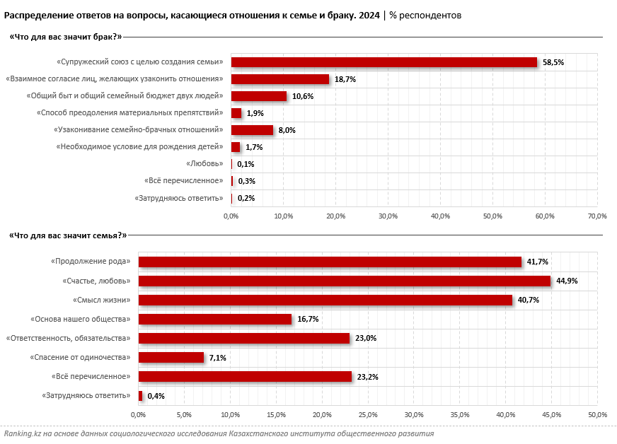 Согласно результатам социологического исследования Казахстанского института общественного развития, граждане РК относятся по-разному к таким понятиям, как «семья» и «брак». Так, семья для большинства респондентов в первую очередь ассоциируется со счастьем и любовью (44,9%), продолжением рода (41,7%) и смыслом жизни (40,7%). Кроме того, 23% опрошенных рассматривают семью как ответственность и обязательства, а 16,7% – как основу общества. При этом лишь 7,1% считают, что семья прежде всего является способом избежать одиночества.