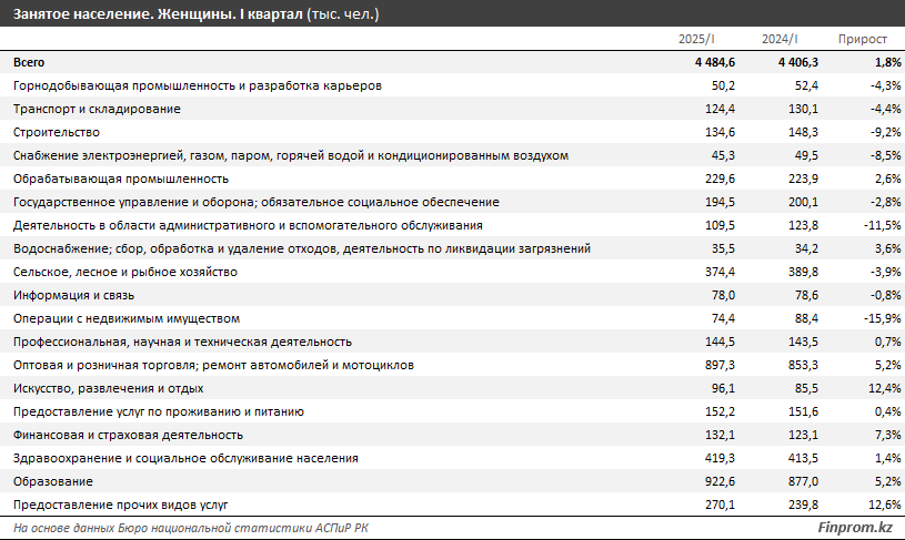 Рассмотрим женскую занятость в разрезе отраслей экономики. Наибольшая численность занятых женщин в Казахстане в первом квартале 2025 года была сосредоточена в сфере образования: 922,6 тыс. человек – на 5,2% больше, чем годом ранее. Второе и третье места по численности занятых женщин заняли сектор оптовой и розничной торговли и авторемонта, а также сфера здравоохранения и социального обслуживания населения.