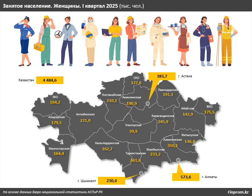 В региональном разрезе наибольшая численность занятых женщин наблюдалась в Алматы: 573,6 тыс. человек – на 3% больше по сравнению с первым кварталом 2024-го. Второе и третье места заняли Астана (383,7 тыс. человек, рост – на 11,6%) и Туркестанская область (361,6 тыс. человек, на 0,8% меньше, чем годом ранее). Наименьшая численность занятых женщин была зарегистрирована в Улытауской (всего 39,9 тыс. человек), Северо-Казахстанской (127,6 тыс. человек) и Жетысуской (136,4 тыс. человек) областях.