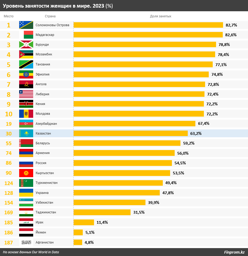 В Казахстане уровень участия женщин в рабочей силе составляет 63,2%. Это означает, что шесть из десяти женщин старше 15 лет входят в состав экономически активного населения. Значение можно считать высоким: по этому показателю РК занимает 30-е место из 187 в мире. Самые высокие показатели занятости женщин зафиксированы на Соломоновых Островах, Мадагаскаре и в Бурунди, а самые низкие – в Афганистане, Йемене и Ираке.