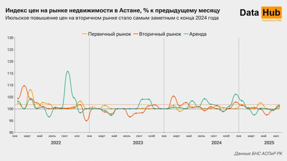 Примечательно, что до этого вторичный рынок в Астане три месяца подряд показывал снижение – с апреля по июнь цены в среднем упали на 1,1%. Подобные серии снижения редки: за последние восемь лет они фиксировались всего дважды. Обычно же по итогам месяца цены либо растут, либо остаются без изменений.