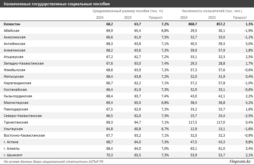 За тот же период государственные социальные пособия получили 868,7 тыс. человек – на 1,3% больше, чем годом ранее. Среднемесячный размер пособия составил 68,2 тыс. тг – на 7,2% больше, чем в 2023-м.