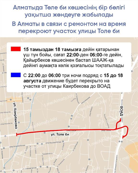 В связи с проведением среднего ремонта участка улицы Толе би, вводятся временные ограничения движения.