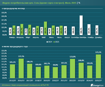 Удорожание в секторе по итогам июля 2025-го составило 1% за месяц. В июне был отмечен рост цен на 1,1%, а в мае наблюдалось самое заметное удорожание в текущем году: сразу на 3,2%. В целом цены на соль растут уже 13 месяцев подряд, при этом в октябре прошлого года было отмечено серьёзное месячное удорожание на 6,5%.