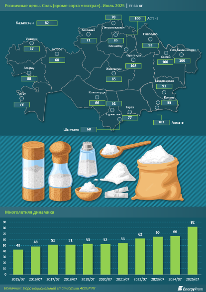 Цены на соль (кроме сорта «экстра») в городах РК по итогам июля 2025 года значительно варьировались: от 61 тг за кг в Туркестане до 103 тг в Алматы. Самая дорогая соль, помимо Алматы, также продавалась в Караганде (102 тг за кг), Астане (100 тг) и Семее (100 тг).