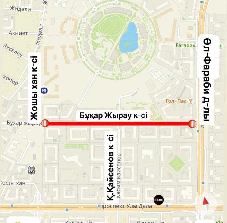 Сначала с пр. Аль-Фараби в сторону пр. Мангилик Ел, затем с ул. Жошы хана в сторону пр. Аль-Фараби.