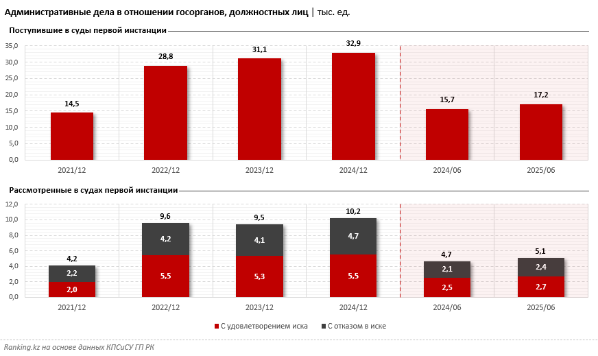 Граждане стали чаще подавать в суды на чиновников. По данным Комитета по правовой статистике и специальным учётам Генеральной прокуратуры (КПСиСУ) РК, за первое полугодие 2025-го в суды первой инстанции поступило около 17,2 тыс. административных дел в отношении госорганов или должностных лиц. В сравнении с январём–июнем прошлого года рост составил 9,3%. Почти все (99,7%) такие дела – это иски об оспаривании тех или иных действий госкомпаний или конкретных чиновников, передает kazlenta.kz со ссылкой на ranking.kz.