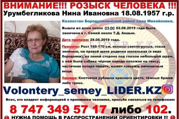 По словам волонтеров LIDER.KZ, второго июня женщину видели в городе Семей возле торгового дома Акшын, но куда после этого пошла женщина, никто не знает. В ночь пропажи на пенсионерке была красная клетчатая рубашка и темные брюки.