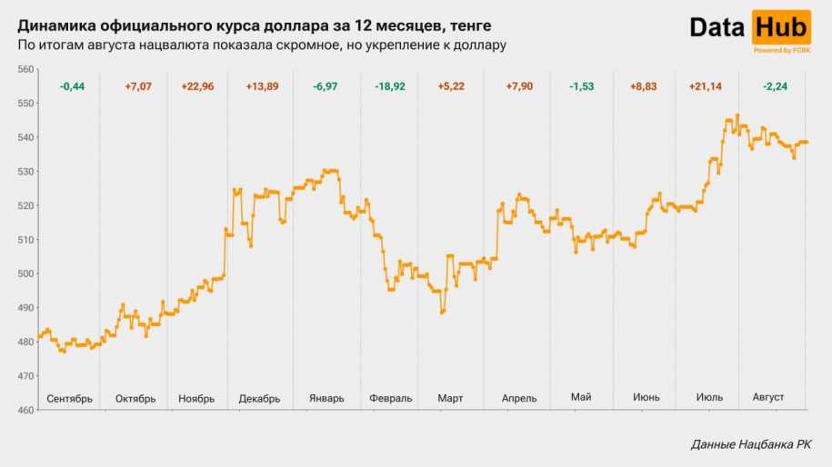 Официальный курс тенге к доллару также слегка улучшился: на 1 сентября он составил 538,54 тг, что на 0,4% ниже значения месяцем ранее. Однако стоит учитывать, что в июле тенге заметно слабел, поэтому сейчас он по-прежнему держится близко к этим относительно высоким уровням.