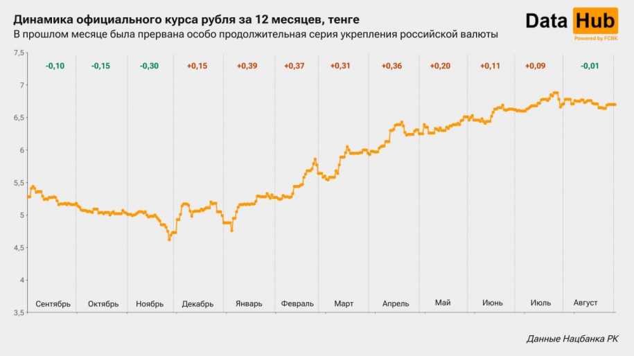 На начало сентября официальный курс рубля составил 6,7 тенге – всего на 0,1% ниже уровня 1 августа. Скромная, но всё же положительная месячная динамика зафиксирована впервые с ноября прошлого года, передает kazlenta.kz со ссылкой на аналитический Telegram-канал DATA HUB.