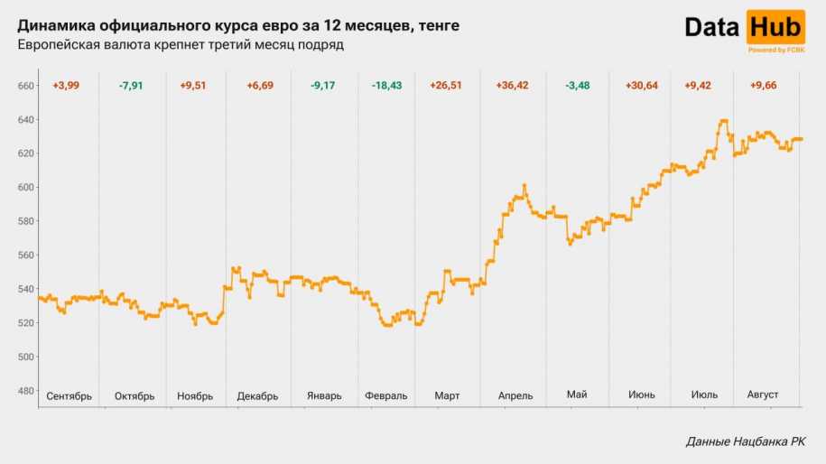 А вот к евро тенге ослаб: курс составил 628,31 тг, что на 1,6% выше показателя на 1 августа. Это стало уже третьим подряд укреплением европейской валюты.