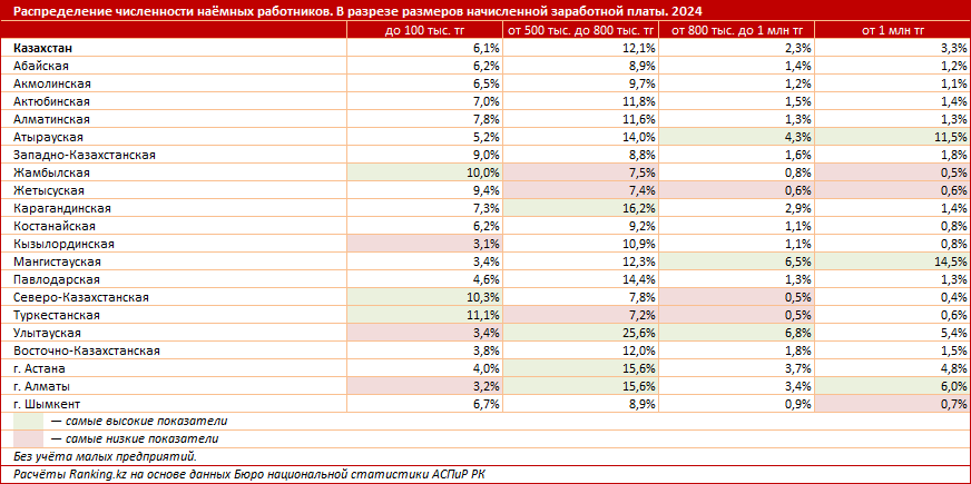 Неоднородность распределения доходов наблюдается не только в зависимости от отраслей экономики, но и в региональном разрезе. В таблице ниже приведены данные по долям самых низкооплачиваемых наёмных работников и тех, кто зарабатывает более 1 млн тг. Эта статистика ещё раз подчёркивает разницу между развитыми нефтяными регионами, мегаполисами и экономически отстающими южными и северными областями.