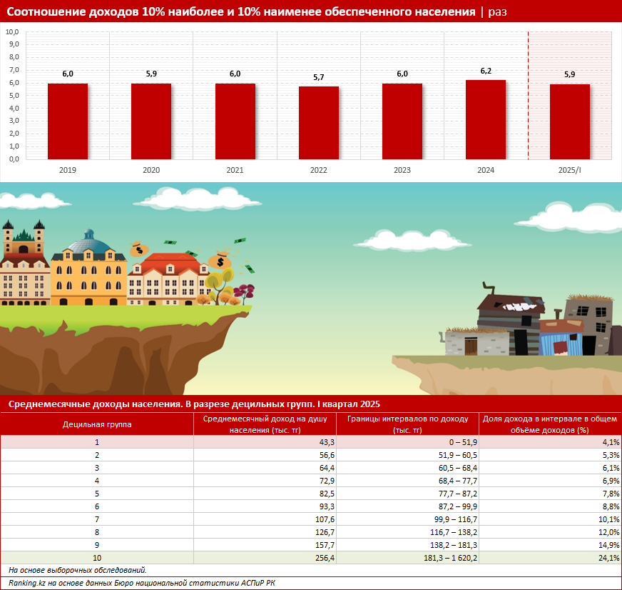 В течение последних нескольких лет в РК не меняется в лучшую сторону ситуация с экономическим неравенством в обществе. Об этом свидетельствует статистический показатель – соотношение доходов 10% наименее обеспеченного и 10% наиболее обеспеченного населения. С 2019 по 2023 год доходы этих двух групп населения отличались в 5,9–6 раз, а в прошлом году – в рекордные 6,2 раза, передает kazlenta.kz со ссылкой на ranking.kz.