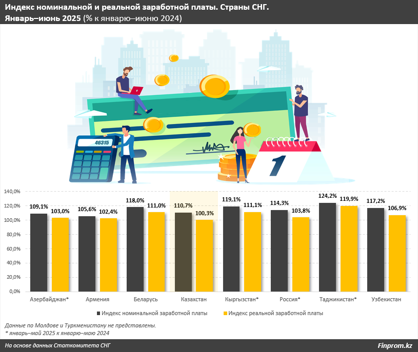 Казахстан проигрывает при сравнении стран СНГ по росту покупательной способности заработных плат. Обобщённые данные по государствам–участникам содружества представил Статкомитет СНГ. Согласно данным источника, в первом полугодии 2025-го индекс реальной зарплаты у казахстанцев оказался самым низким в СНГ: 100,3%. Можно сказать, что покупательная способность зарплат в РК и вовсе не выросла, оставшись на уровне января–июня прошлого года, передает kazlenta.kz со ссылкой на finprom.kz.