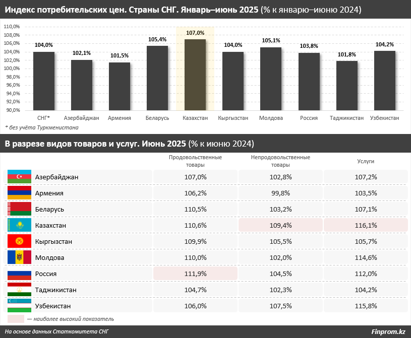 По сравнительным данным Статкомитета СНГ, в июне 2025 года в Казахстане действительно были самые высокие в содружестве индексы цен на непродовольственные товары (109,4%) и услуги (116,1%). Страной с самыми быстро дорожающими продуктами питания стала Россия: 111,9%.