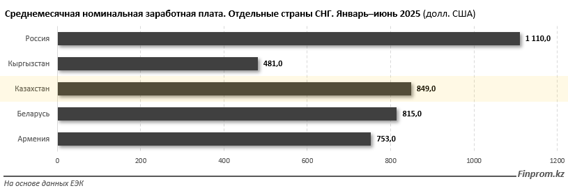 Самым высоким показателем отличился Таджикистан: 124,2%. При этом зарплаты в этой стране можно отнести к одним из самых низких в СНГ и ЦА. По данным Министерства труда и занятости населения Таджикистана, в июне 2025 среднемесячная номинальная заработная плата по стране составила 2,6 тыс. сомони, или 264 долл. США по курсу на конец июня. Эта сумма кратно меньше, чем во многих других соседних странах. Вот для примера данные, которые приводит Евразийская экономическая комиссия. Наибольшая номинальная зарплата среди стран ЕАЭС в первом полугодии 2025-го была зафиксирована в России: 1,1 тыс. долл. США. Казахстан оказался на втором месте с показателем в 849 долл. США. Следом идут Беларусь (815 долл. США) и Армения (753 долл. США). Наименьшая среди стран ЕАЭС номинальная зарплата была отмечена в Кыргызстане: 481 долл. США.