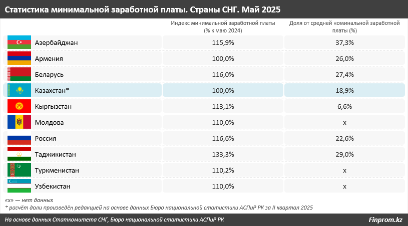 Последний раз минимальную зарплату в РК повышали более чем полтора года назад – 1 января 2024 года. Тогда она выросла с 70 тыс. до 85 тыс. тг. Именно нерегулярность в повышении такого социально важного индикатора привела к тому, что Казахстан встал в пару с Арменией, где «минималка» в мае этого года не выросла совсем. С учётом инфляции можно отметить, что покупательная способность минимальной заработной платы в стране упала. В остальных государствах СНГ правительства увеличили минимальные заработные платы на 10%–33,3%.