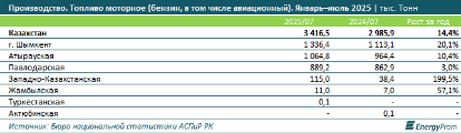 За январь–июль текущего года в Казахстане произвели 3,4 млн тонн моторного топлива (бензина, в том числе авиационного) – на 14,4% больше, чем за аналогичный период 2024-го, передает kazlenta.kz со ссылкой на energyprom.kz.