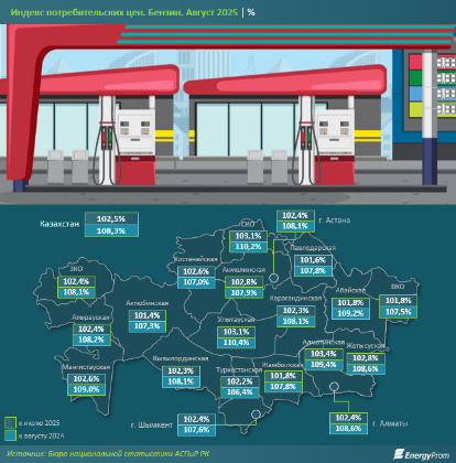В годовой динамике наибольший рост цен на бензин был отмечен в Улытауской (на 10,4%), Северо-Казахстанской (на 10,2%) и Алматинской (на 9,4%) областях, а наименьший — в Туркестанской (на 6,4%), Костанайской (на 7%) и Актюбинской (на 7,3%) областях.