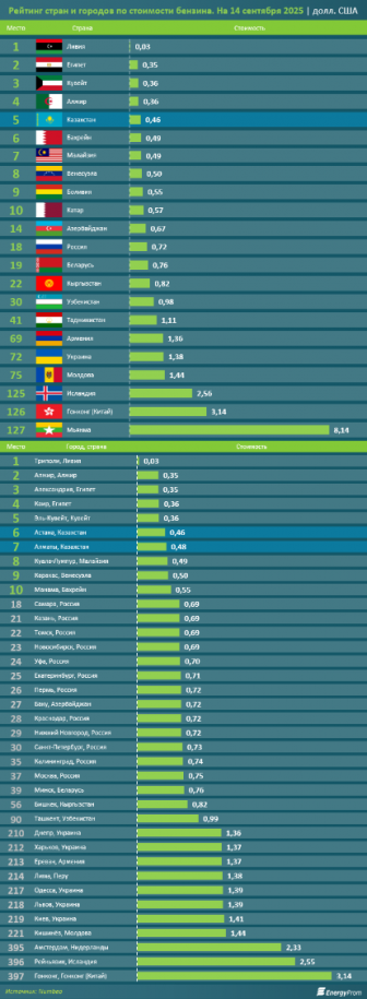 В рейтинге городов мира Астана и Алматы попали в десятку лучших по дешевизне бензина среди участвующих. В Астане стоимость литра бензина составила 0,46 долл. США, в Алматы — 0,48 долл. США. Самая высокая цена среди городов СНГ была отмечена в Кишинёве: 1,44 долл. США за литр бензина. В мире же самыми «дорогими» в плане бензина городами оказались Гонконг, Рейкьявик и Амстердам, а самыми «дешёвыми» – Триполи, Алжир, Александрия, Каир и Эль-Кувейт.