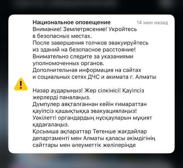 Сегодня, 21 сентября, жители Алматы получили на телефоны экстренные уведомления о землетрясении. Система оповещения предупредила горожан укрыться в безопасных местах, а после окончания толчков — покинуть здания и держаться на безопасном расстоянии.