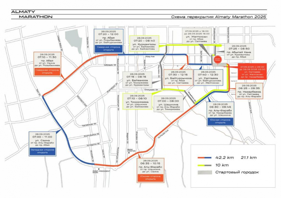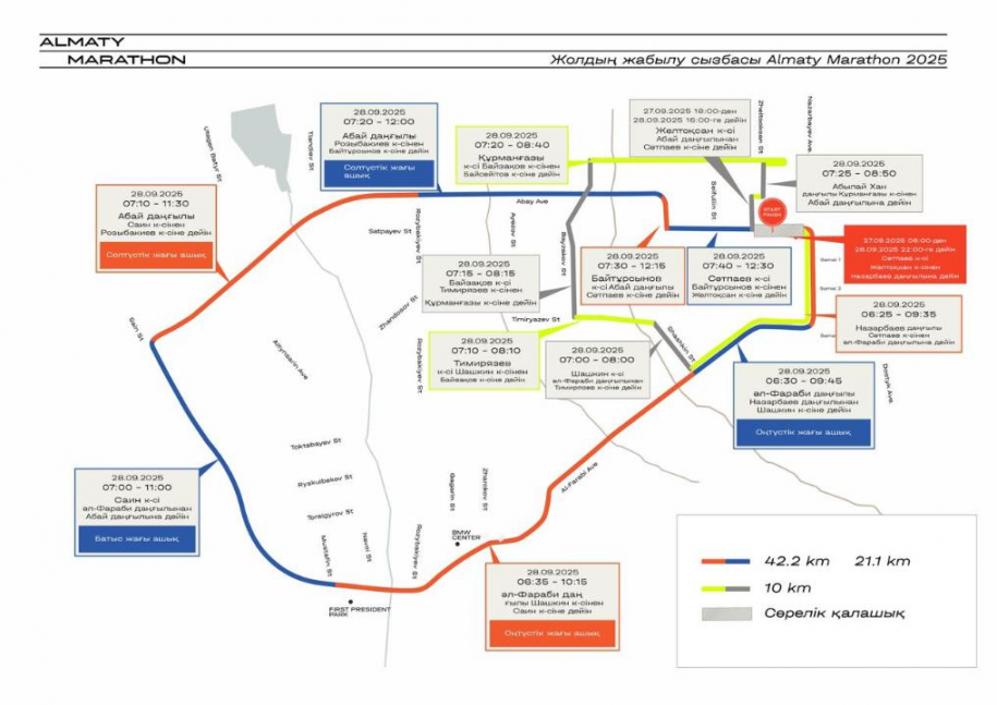 В пресс-службе акимата предупредили горожан и гостей города о временных ограничениях движения. Основные перекрытия запланированы с 6:25 до 12:30 вдоль маршрута марафона, при этом по мере прохождения дистанции спортсменами дороги будут постепенно открываться.