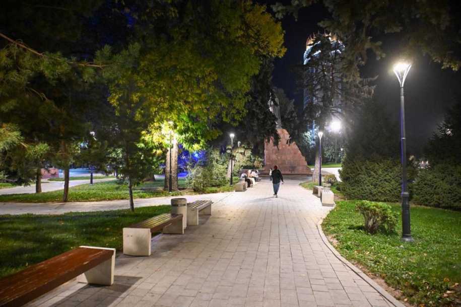 В сквере Дворца Республики 65 торшерных светильников заменены на светодиодные мощностью 100 Вт с тёплым светом. Новые LED-светильники отличаются высокой яркостью, низким энергопотреблением и длительным сроком службы.