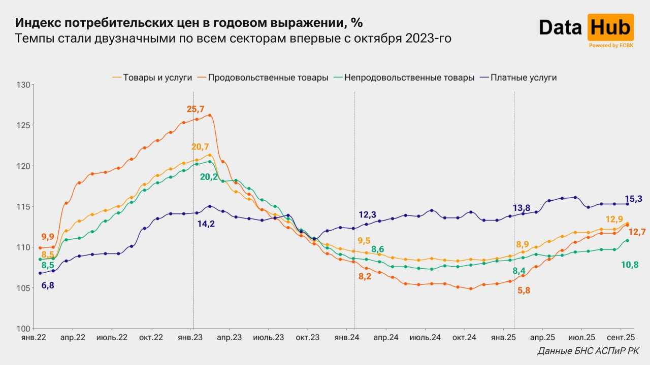 По итогам сентября цены в непродовольственном сегменте выросли на 1,5% – это самый высокий месячный показатель с ноября 2022 года. За последние десять лет столь заметный рост в сентябре фиксировался лишь дважды: в 2022-м и в 2015-м, когда Казахстан перешёл на плавающий курс тенге, передает kazlenta.kz со ссылкой на аналитический Telegram-канал DATA HUB.