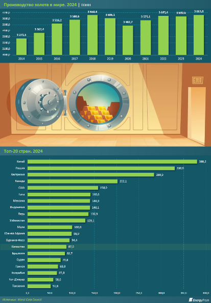 Казахстан, по информации World Gold Council, расположился на 14-м месте с объёмом производства в 87 тонн. World Gold Council публикует данные на основе методологии Metals Focus, где учитывается так называемое refined или paid gold – золото, за которое фактически платит аффинажный завод. То есть речь идёт не о массе золотоносной руды или полуфабрикатов, а о металле после переработки, максимально близком к аффинированному золоту.