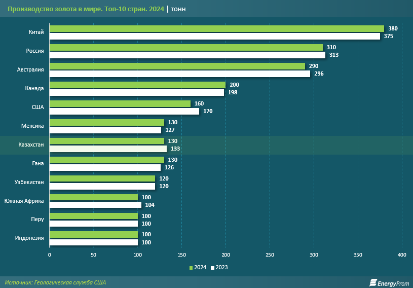 Тем временем по данным Геологической службы США, Казахстан и вовсе закрепился в топ-10 стран с объёмом произведённого золота в 130 тонн – на 2,3% меньше, чем в 2023 году. В целом, по информации этого ведомства, в мире было выпущено 3,3 тыс. тонн золота, лидируют также Китай (380 тонн), Россия (310 тонн), Австралия (290 тонн), Канада (200 тонн) и США (160 тонн).