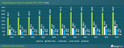 Среди государств СНГ по объёму произведённого золота РК уступает России и Узбекистану, которые вошли в топ-10, и опережает Кыргызстан, где выпустили 23,6 тонны драгоценного металла. На прочие страны СНГ пришлось 14,2 тонны – сразу на 11,9% меньше, чем по итогам 2023 года. В Казахстане и Кыргызстане, согласно World Gold Council, производство золота также сократилось: на 1,3% и на 7,5% соответственно. В России и Узбекистане, наоборот, выпуск вырос на 2,6% и на 7,9% соответственно.