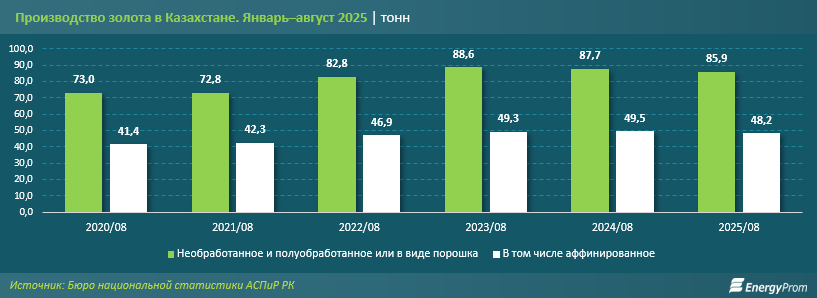 Поговорим о текущем годе. Согласно оперативным данным БНС, за январь–август 2025-го в стране произвели 85,9 тонн необработанного и полуобработанного золота, а также золота в виде порошка золота – на 2,1% меньше, чем за аналогичный период прошлого года. Из них на аффинированное золото пришлось 48,2 тонны – на 2,5% меньше, чем годом ранее.