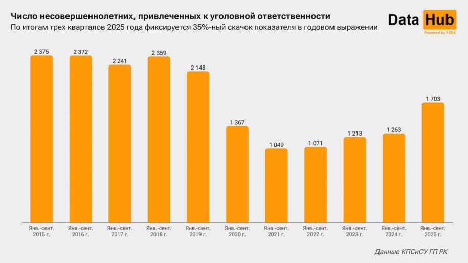 В январе–сентябре 2025 года к уголовной ответственности привлекли 1703 несовершеннолетних – на 35% больше, чем за тот же период 2024-го. Это максимальный показатель с 2019 года, передает kazlenta.kz со ссылкой на аналитический Telegram-канал DATA HUB.