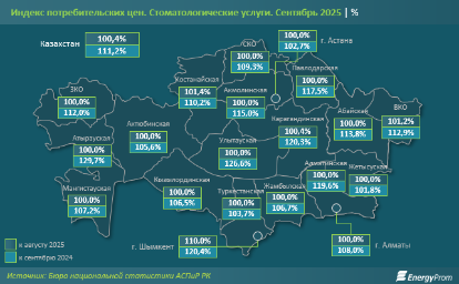 В годовой динамике удорожание стоматологических услуг было зафиксировано во всех регионах страны. Наибольший рост цен был отмечен в Атырауской (на 29,7%) и Улытауской (на 26,6%) областях, а также в Шымкенте (на 20,4%), наименьший – в Жетысуской области (на 1,8%), Астане (на 2,7%) и Туркестанской области (на 3,7%).