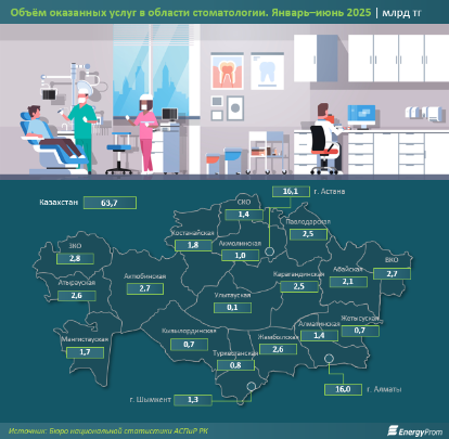 В региональном разрезе наибольший объём стоматологических услуг пришёлся на Астану: 16,1 млрд тг, против 11,8 млрд тг годом ранее (рост – на 36,1%). На втором и третьем местах расположились Алматы (16 млрд тг) и Западно-Казахстанская область (2,8 млрд тг). В пятёрку лидеров также вошли Восточно-Казахстанская и Актюбинская области (по 2,7 млрд тг в каждом из регионов).