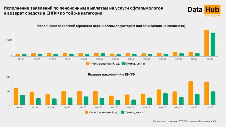 По данным ЕНПФ, в сентябре было исполнено 1611 заявлений на оплату офтальмологических услуг на общую сумму 1,4 млрд тенге. По сравнению с августом показатели выросли в 5,8 и 7 раз соответственно. Если же сравнивать с среднемесячными значениями за предыдущий год, рост оказался еще более значительным — в 7,9 и 9,3 раза.