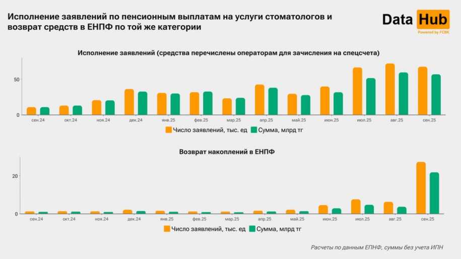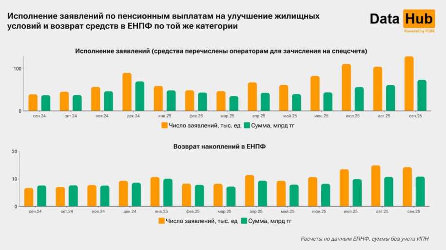 Что касается выплат на улучшение жилищных условий, то здесь наблюдается стабильный рост. В сентябре исполнено 128,9 тыс. заявлений на сумму 73,3 млрд тенге, что примерно на 20% больше, чем месяцем ранее. Возвраты средств при этом остались на прежнем уровне – 10,8 млрд тенге по 14,2 тыс. заявлений.