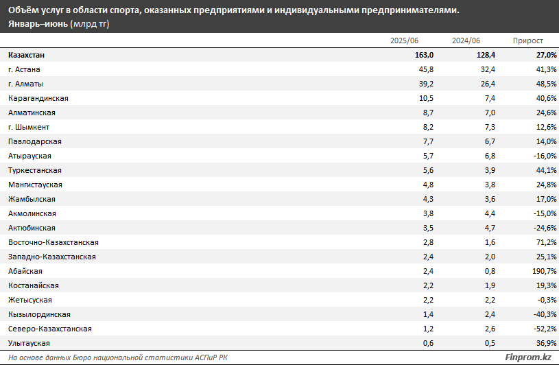 Лидерами по объёму оказанных услуг стали Астана (45,8 млрд тг, +41,3%), Алматы (39,2 млрд тг, +48,5%) и Карагандинская область (10,5 млрд тг, +40,6%). На эти три региона пришлось почти 59% всех спортивных услуг в стране. Меньше всего – в Улытауской, Северо-Казахстанской и Кызылординской областях.