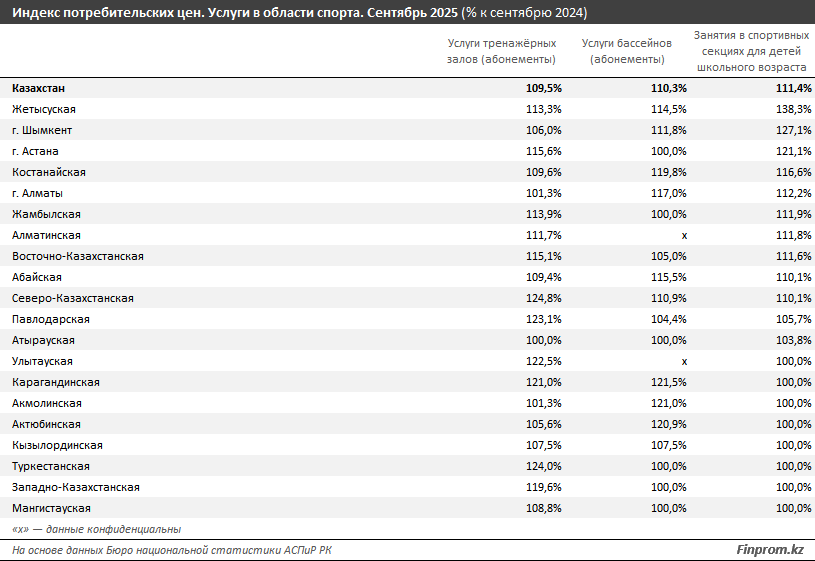 Абонементы в бассейны подорожали сильнее всего в Карагандинской (на 21,5%) и Акмолинской (на 21%) областях, а занятия в детских секциях – в Жетысуской области (на 38,3%) и Шымкенте (на 27,1%).