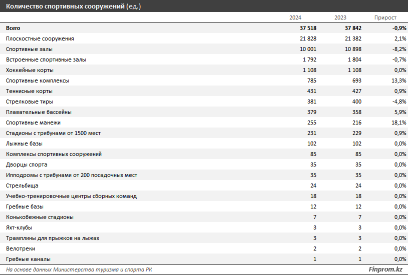 В 2024 году в Казахстане насчитывалось 37,5 тыс. спортивных сооружений, что на 0,9% меньше, чем годом ранее. Более половины (52,2%) из них расположены в сельской местности.