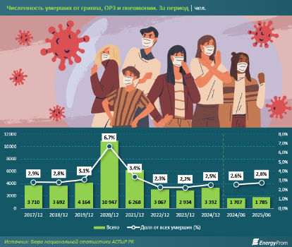 В 2024 году в Казахстане от гриппа, ОРЗ и пневмонии умерли 3,4 тыс. человек, что на 15,6% больше, чем годом ранее. Таким образом, показатели вернулись к доковидному уровню – для сравнения, в 2019 году от этих заболеваний умерли 4,2 тыс. человек, а в 2020-м, на фоне пандемии COVID-19, – почти 11 тыс.