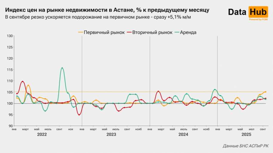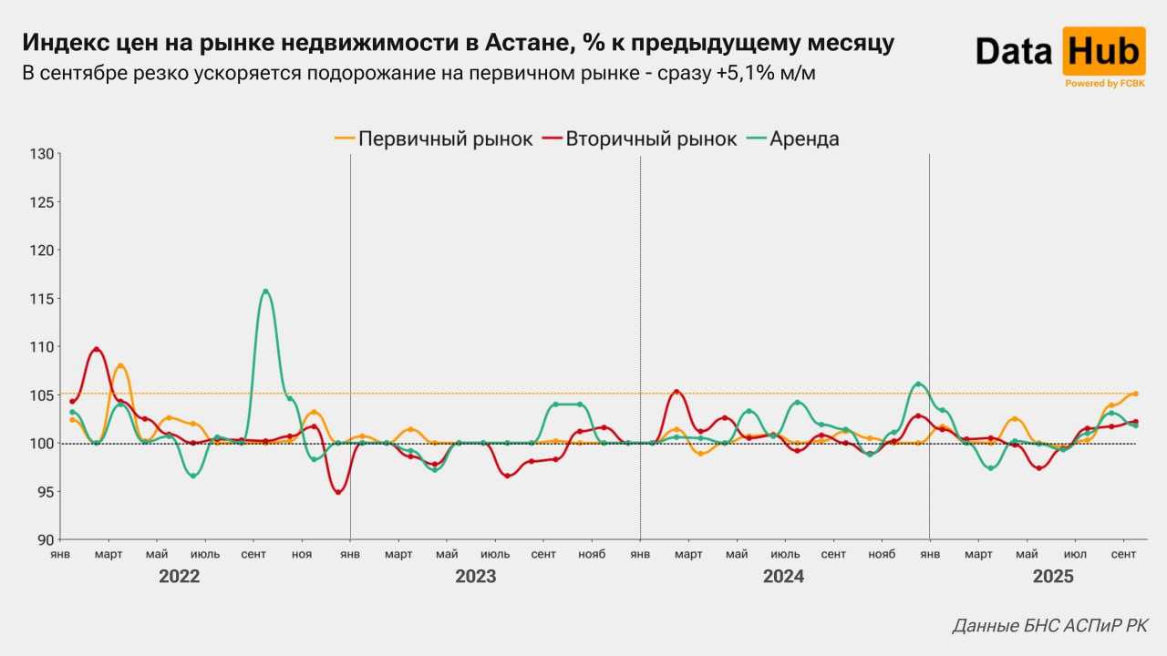 В сентябре 2025 года цены на первичном рынке жилья в Астане выросли сразу на 5,1% за месяц, показав один из самых резких скачков за последние десять лет, передает kazlenta.kz со ссылкой на аналитический Telegram-канал DATA HUB.