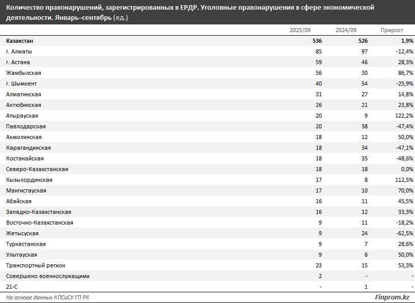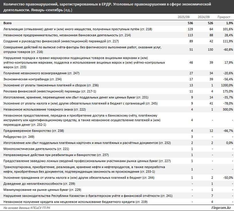 По данным официальной статистики, за январь–сентябрь 2025 года в Казахстане зарегистрировано 536 уголовных правонарушений в сфере экономической деятельности – на 1,9% больше, чем за тот же период прошлого года.